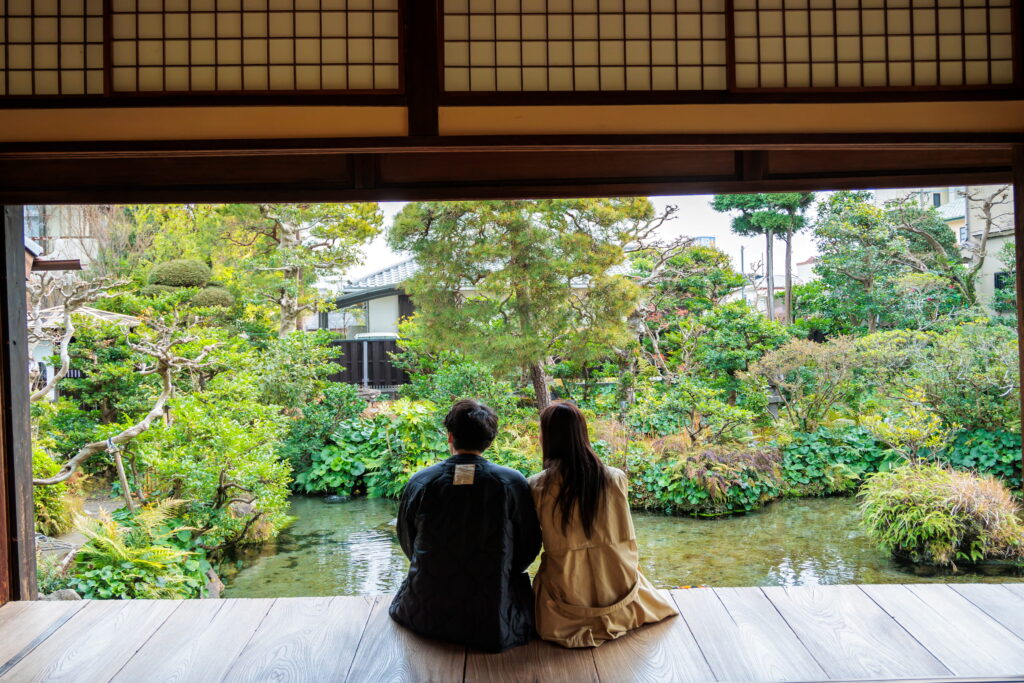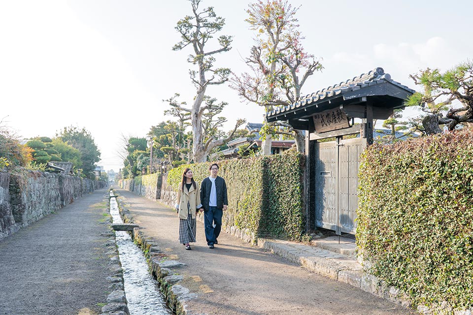 街の至るところに湧水地がある島原市。四明荘は明治時代の医師・伊藤元三氏の別邸で、敷地に湧く清水を愛(め)でるために建てられました。当時は座敷から庭と島原湾とが一体となった風景を楽しめたそう。今でも一日に3000tが湧出し、縁側に座れば水の音や涼やかな風に心和みます。湧水で入れたお茶のサービスも。
