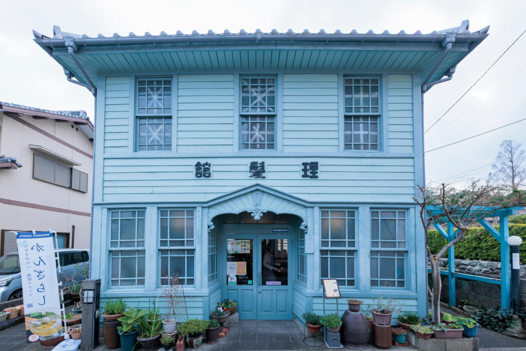 商店街の一角にある水色の洋館は1923(大正12)年に建てられた理髪店。現在は喫茶店として、観光客や地元の方の憩いの場として親しまれています。メニューは体にいい素材で手作りされるスイーツやランチ。島原産イチゴを使用した「ラブラブケーキ」など、見て食べて満足できるメニューがそろいます。