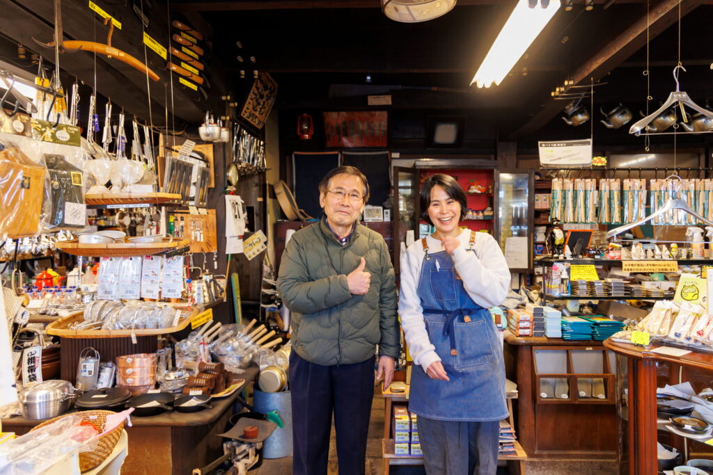 1877(明治10)年から続く、九州で二番目に歴史の長い金物店「猪原金物店」。町屋造りの店舗に並ぶのは、刃物をはじめとした台所用品から手裏剣や和くぎといった珍品まで“日本の職人が作る道具”。長く使い続けてほしいと、修理や刃物研ぎにも対応してくれます。土・日曜、祝日限定で具雑煮やかんざらしが味わえるカフェもオープン。