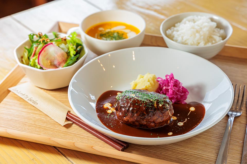 平成新山に向かう島原まゆやまロードの出発点に位置し、店内やテラスからは島原湾の絶景を楽しめます。ランチのおすすめは、肉のおいしさを凝縮させた「ハンバーグランチ」。島原の湧水で育つご飯が進みます。手作りスイーツと好みのカップを選べるコーヒーと一緒に、テラスでのんびりするのもおすすめ。