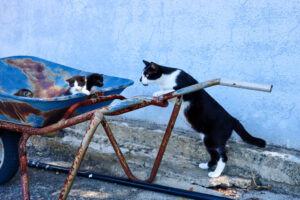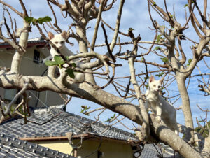 撮影できればラッキー程度に考え、傘を持たず雨に濡れながら歩いていると、愛し合う二匹の猫を発見。成就するのかな?とほほえみながらカメラを構えた瞬間、メス猫に睨まれて驚いたチャトラ猫「しまさん」が後ろに飛びのいて立ち尽くす姿が。
